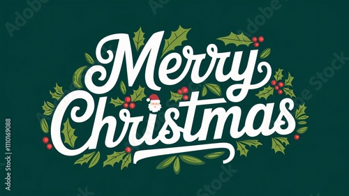 Merry Christmas Festive Typography Design, Holly, Santa, Green Background