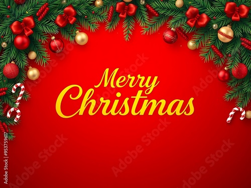 Merry Christmas Greeting with Evergreen Branches, Ornaments, and Candy Canes