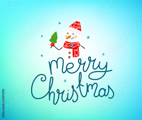 Merry christmas hand drawn lettering inscription vector banner. Calligraphic logo template. Artistic text with cute snowman