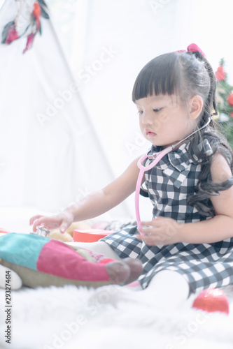 Merry christmas happy little child with beautifully decorated christmas tree holidays in home, christmas concept
