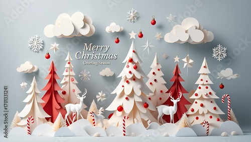 christmas, tree, cervid, snowflake, paper, art, holiday, winter, decoration, ornament, season, celebration, card, new, year, design, snow, cloud, red, gift, merry, festive, event, graphic, element