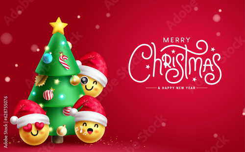 Merry christmas text vector design. Christmas pine tree ornaments with emojis characters wearing santa hat elements. Vector illustration season greeting card in red background.