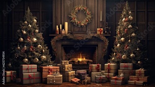 christmas, tree, holiday, decorated, winter, celebration, merry, gift, festive, red, seasonal, new, ornament, christmas, light, background, snow, fir, present, night, year, december, box, design, evening, tradition, nobody, home, eve, magic, illuminated, pine, card, vintage, snowy, garland, white, toy, shiny, bow, ribbon, green, room, interior, gold, dark, christmas tree, frost, cold