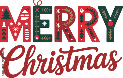 “Merry Christmas Typography Design – Festive Red & Green Lettering with Holiday Motifs”