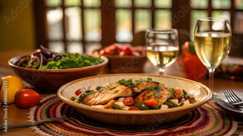 food, food, wine, dinner, salad, plate, eatery, epicure, dish, lunch, red, glasses, vegetable, kitchen, meat, sauce, white, fish, seafood, table, cheese, healthy, delicious, salmon