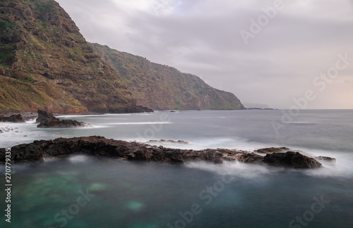 Mesa del Mar volcanic rocks coastline, long exposure photography, Atlantic ocean with sunset light, Tacoronte, Tenerife, Canary islands, Spain