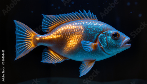 fish, glowing, aquatic, blue, amber, underwater, environment, smooth, movement, illumination, nature, ocean, wildlife, marin, aethereal, surreal, vibrant, scale, elegance, beauty, light, darkness, sea, majestic, swimming, fresh, fluid, creature, calmness, fascination, dark, biology, marine life, shimmer, colours, wonder, grace, surrealism, fluidity, exploration, enchantment