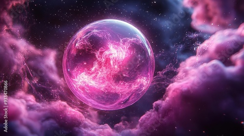 mesmerizing pink bubble floating in space iridescent surface reflects light creating a dreamy and surreal image against a dark background