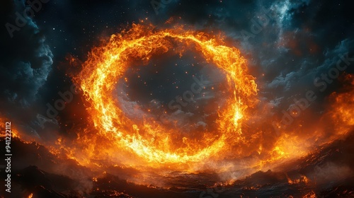 mesmerizing ring of fire against starry night sky flames dancing and intertwining sparks spiraling outward smoky tendrils forming mystical symbols within circle