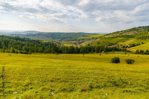 Mesmerizing shot of a rural landscape with trees, hills and houses in the background