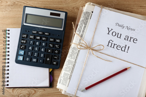 stack, closeup, accounting, background, board, business, calculating machine, colours, concept, wax crayons, depressed, employment, fired, information, job, idled, layoff, lost, message, newspaper, newspaper, note, notice, office, paper, crayons, phrase, pile, post, print, printed, problem, rope, sheet, stress, table, text, tied, trouble, unemployed, white, wooden, word, word, work, workplace, worktop, write, writing, written