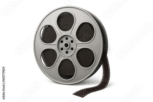 Metal film reel unwinding, showing the film strip, isolated on transparent background, perfect for cinema and movie-related projects