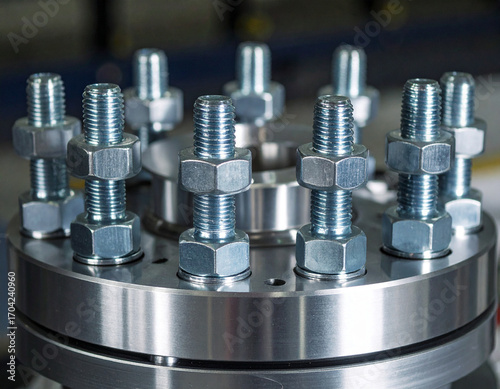 flange, metal, bolt, nut, industrial, connection, silver, shiny, engineering, construction, detail, steel, mechanical, equipment, fastener, hardware, industry, machinery, metallic, chrome, closeup, technology, manufacturing, precision, strength, secure, threaded, round, circle, cylinder, tight, support, structure, component, part, assembly, maintenance, repair, workshop, factory, production, iron, stainless, steelwork, metalwork, fastening, joinery, fixing, bolt