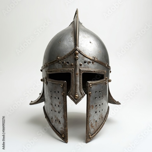 Metal helmet with pointed top and flat bottom. Ornate design with small holes on front. Unique features of mediaeval warrior helmet. Centrally positioned on white background.