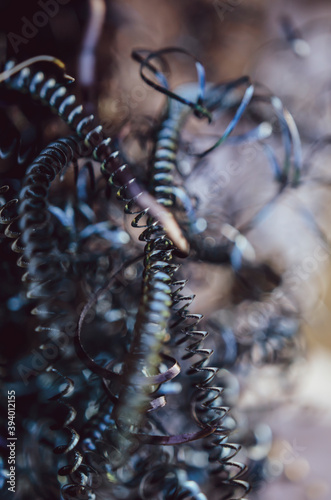 Metal offcuts. rusty swarf debris, waste pieces from turning process of metal working with lathe machine, rusty string structure, material recycling, manufacture process waste, industrial background,