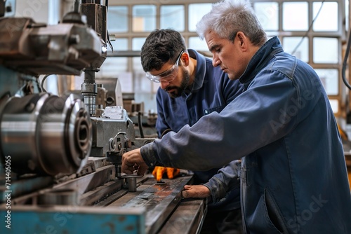 Metal worker teaching trainee on machine use