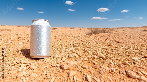 Metallic Can with Water Droplets in Arid Desert Landscape Under Bright Sky