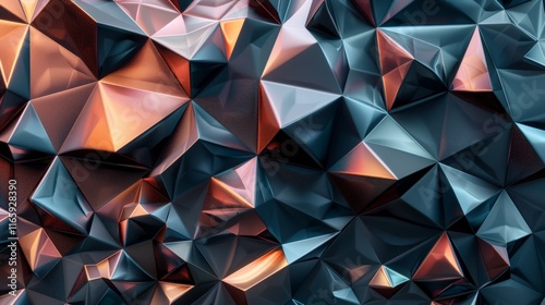 Metallic copper and teal low poly triangular geometric surface forming an abstract wallpaper background