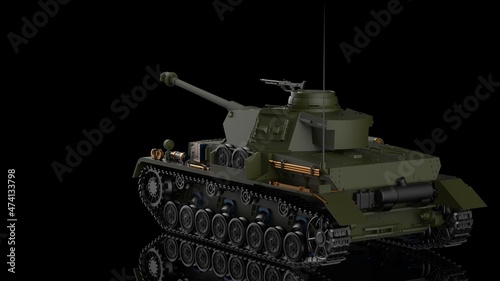 Metallic dark green military tank on black-white flash lighting background. Concept image of power strength, dynamic strategy and Strong system. 3D illustration. 3D high quality rendering. 3D CG.