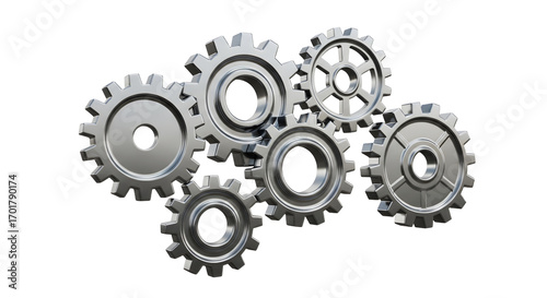 Metallic Gears Interlocking Mechanical Cogs in Silver on White Background