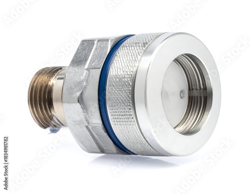 metal, shiny, hardware, component, industrial, equipment, silver, threaded, fitting, mechanical, connector, detail, isolated, white, closeup, machine, part, steel, screw, tool, engineering, technology, manufacturing, attachment, device, assembly, round, ring, blue, seal