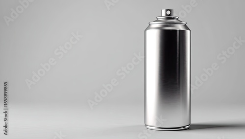 spray, can, metal, silver, chrome, shiny, aluminium, product, container, cardboard box, graphic, isolated, studio, light, grey, background, blank, empty, three-dimensional, rendering, advertising, design, illustration, modern, minimalist, object, cylinder, reflective, smooth, clean, image, promotion, presentation, digital, marketing, template, metallic, glossy