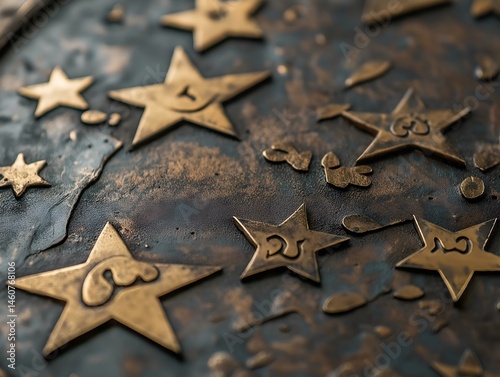 metallic surface, embossed stars, gold accents, dark background, celestial texture