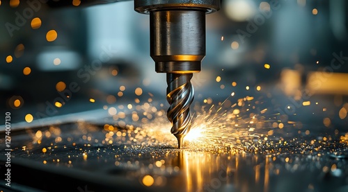 Metalworking drill bit in action with bright orange sparks flying during industrial manufacturing process on metal surface with bokeh background.