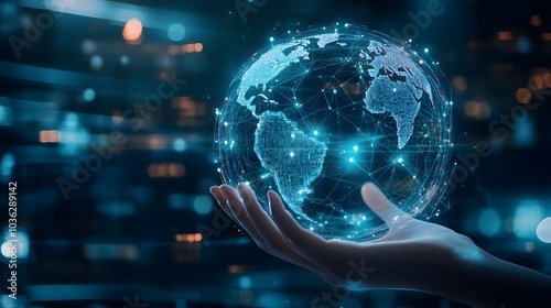 Metaverse Technology concepts. Woman hand holding global network connection. Internet communication, Wireless connection technology. Futuristic technology with polygonal shapes.