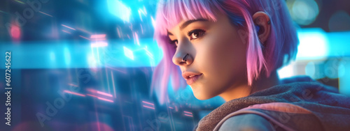 Metaverse with teenage young girl with pink and blue hair. Virtual world experience. Future concept.Generative Ai content