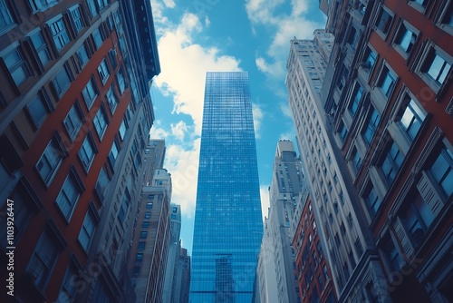 city, building, skyscraper, city landscape, urban, metropolis, street, perspective, backview, highrise, modern architecture, blue glass, city landscape, daytime, sunlight, shadow, contrast, brickwork, masonry, height, elevation, blue skies, white cloud, urban setting, verticality, composition, structure, impressive, tower, blue tone, loft, skyscraper