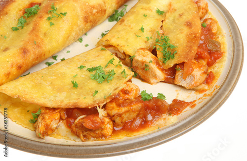 food, mexican, baked, cheese, chicken, cooked, dinner, hot, meal, meat, parsley, plate, red, salsa, sauce, spicey, texmex, tomatoes, tortilla, 2, closeup, macro, folded, stuffed, isolated, white, cut, open