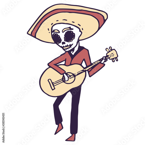 Mexican guitar player on white isolated backdrop. Day of the dead symbol for invitation or gift card, notebook, bath tile, scrapbook Phone case or cloth print Doodle style stock vector illustration