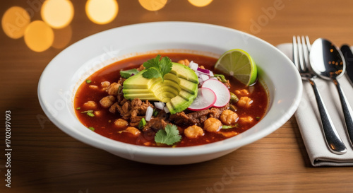 soup, stew, mexican, cookery, food, healthy, dinner, lunch, savoury, spicey, bowl, eatery, fine dining, upscale, delicious, fresh, radish, avocado, onion, lime, cilantro, ingredient, culinary, professional, prepared, studio, background, bokeh, nobody, half face, horizontal, closeup, photo, dark, elegant, white, serving, rustic, new, tasty, unique, traditional, warm, comfort food, epicure, meal, dish, hot