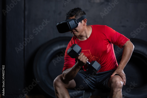 Mexican sportsman doing a weight training exercise by using dumbbell and virtual reality vr goggles, metaverse workout