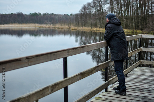 man, afford, marina, lough, water, jacket, poland, man, alone, look, wooden, cloud, forest, tree, shore, reflections
