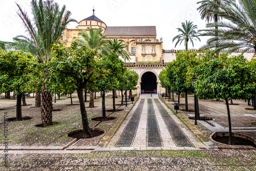 Mezquita Garden. View of the Patio de los Naranjos at the Mezquita of Cordoba. The mezquita, or now Cordoba Cathedral, was once the second largest mosque in the world. It was later converted to a cath