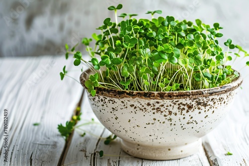 Microgreen broccoli in bowl on wooden background