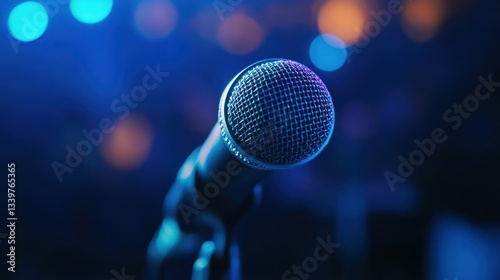 microphone, music, stage, concert, audio, performance, sound, recording, singing, speaker, instrument, voice, show, entertainment, karaoke, broadcast, studio, technology, equipment, podcast, vocal, artist, band, lighting, blue, dark, night, event, festival, gig, tune, melody, rythm, harmony, song, ambient, atmosphere, closeup, sharpened, detail