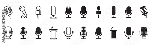 Microphone icon set featuring various styles, including karaoke and podcast microphones. Ideal for web and mobile applications. Vector illustration eps 10.