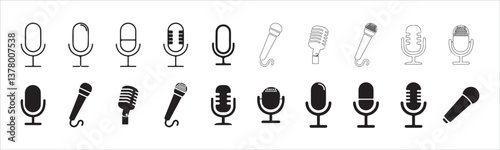 Microphone icon set featuring various styles, including karaoke and podcast microphones. Ideal for web and mobile applications. Vector illustration eps 10.
