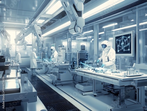 laboratory, technology, science, innovation, research, medicals, microscopic, robotic, manufacturing, holographic, futuristic, clean, precision, three-dimensional, imaging, fabrication, assembly, automation, production, swarm, replication, nanotechnology, pristine, lighting, blue, protective, gear, intricate, delicate, process, chamber, futurism, modernism, engineering
