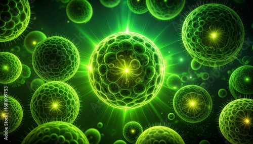 Microscopic view of microbial cells in glowing emerald green tones, intricate textures with soft halos, futuristic biotech and abstract scientific background.