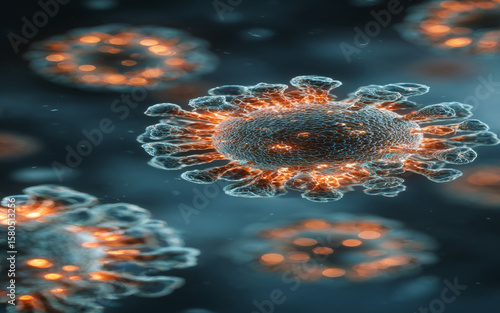 Microscopic Virus Visualization – Realistic Pathogen Structure on Blue Scientific Background