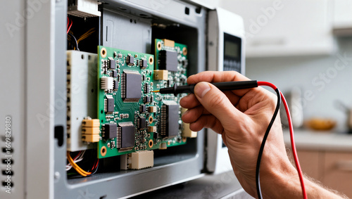 microwave, repair, multimeter, kitchen, appliance, circuit board, home, hand, probe, service, testing, electrical, inspection, interior, electronic, electricity, engineer, technology, equipment, maintenance, diagnostic, technician, broken, occupation, household, engineering, indoor, connection, cable, control, device, tool, job, professional, men at work, fixing, handyman, skill, expert, expertise, board, electronic