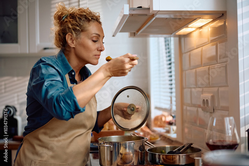 Mid adult woman tasting food while cooking for Thanksgiving in kitchen.