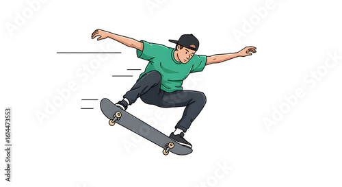 skateboarding, skateboarder, jump, extreme sport, urban, youth culture, action, dynamic, cool, active, street, board, male, young men, hobby, recreation, isolated, white background, illustration, design element, graphic, sport, freedom, lifestyle, motion, skateboard, boy, vector