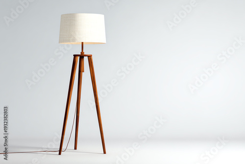 Mid-Century Modern Floor Lamp: A stylish floor lamp with a wooden tripod base and a soft, warm light illuminates the space. A minimalist design in a modern interior.