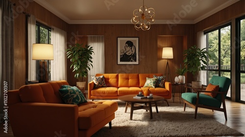 Mid-century modern living room with a bold orange sofa