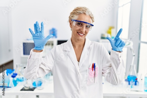 Middle age blonde woman working at scientist laboratory showing and pointing up with fingers number seven while smiling confident and happy.